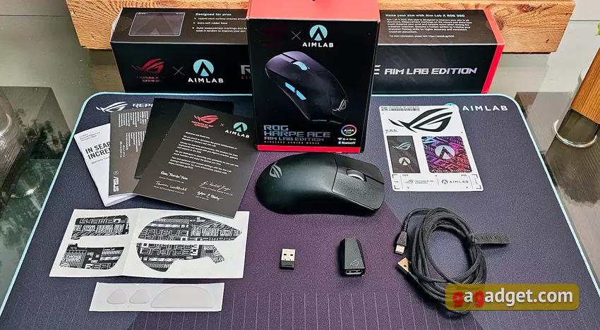 Die ASUS ROG Harpe Ace Aim Lab Edition ist in einem hellen Karton in den üblichen ROG-Farben Schwarz und Rot mit allen grundlegenden Informationen verpackt. Das Set erweist sich als recht interessant. Die Box enthält die Maus selbst, ein ROG-Paracord-Kabel, einen USB-Typ-C-auf-Typ-A-Adapter, einen sehr kompakten USB-Sender, Ersatz-Teflon-Füße, vier Gummiaufkleber an den Seiten des Gehäuses und den Haupttasten für einen zuverlässigeren Halt, einen Satz Aufkleber in Form von Aim- und ROG-Logos und eine Dokumentation.