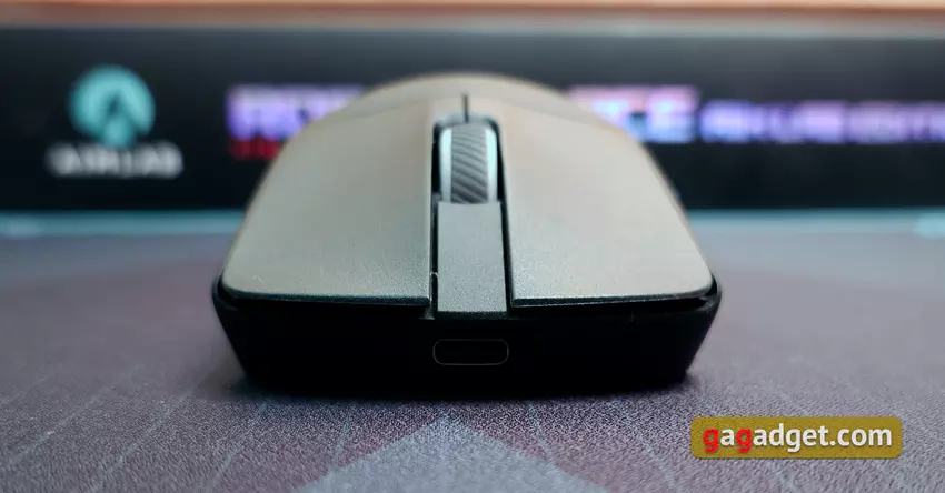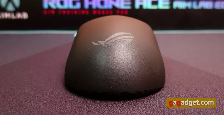 ASUS ROG Harpe Ace Aim Lab hat mittlere Abmessungen: 127,5x63,7x39,6 mm. Aber sie wiegt nur 54 g ohne Sender und Kabel, was beeindruckend ist. Die Maus wird von Fans ultraleichter Modelle geschätzt werden.