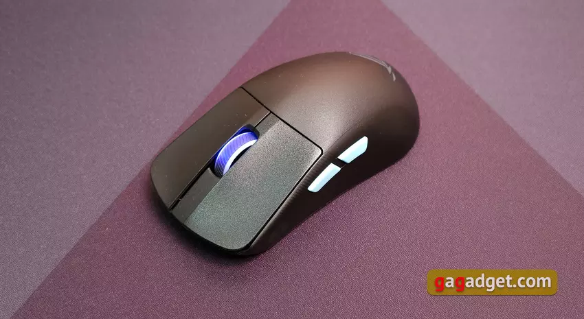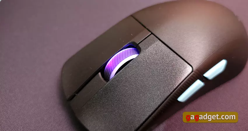 Das Scrollrad ist durchsichtig, hat eine Gummibeschichtung mit diagonalen Einkerbungen und eine RGB-Hintergrundbeleuchtung.
