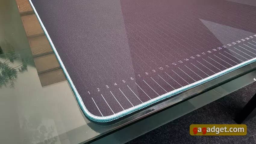 Wir haben die ASUS ROG Harpe Ace Aim Lab Edition mit der proprietären ROG Hone Ace Aim Lab Edition Gaming-Oberfläche verwendet. Sie hat eine Stoffoberfläche und recht große Abmessungen von 508x420 mm. Neben der Maus lag auch der ASUS ROG Zephyrus M16 (2023) Laptop sehr gut auf der Oberfläche. Die Oberfläche ist dunkelgrau mit hellen Nähten am Rand. Auf der Vorderseite befinden sich Messmarkierungen in Zentimetern für das Training der Genauigkeit im Aim Lab.