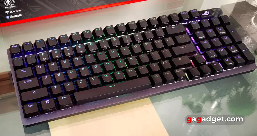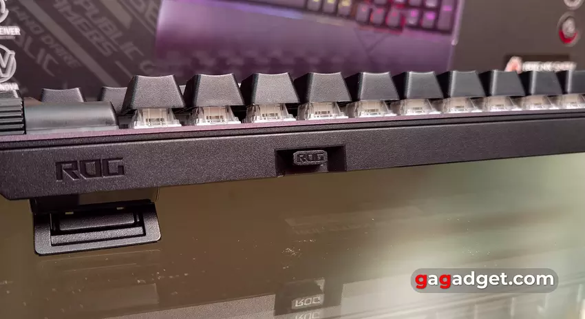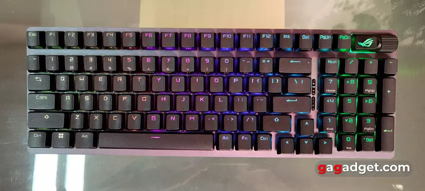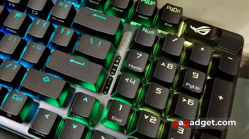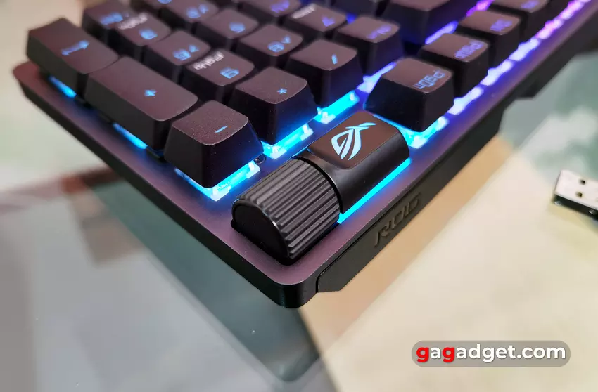 Zu den interessanten ungewöhnlichen Elementen gehören eine Multifunktionstaste mit einem beleuchteten ROG-Logo und ein Rad in der oberen rechten Ecke der Tastatur. Damit können Sie die Wiedergabe von Multimediadateien steuern, die Lautstärke einstellen und die Hintergrundbeleuchtung der Tastatur regeln. Etwas Ähnliches haben wir bereits beim ASUS ROG Azoth gesehen.