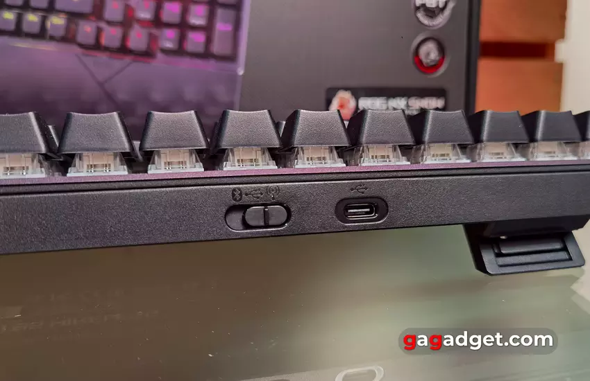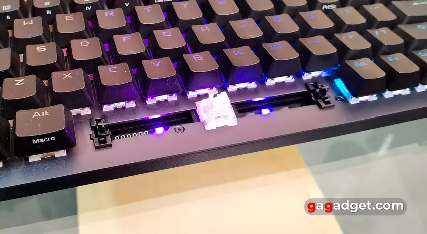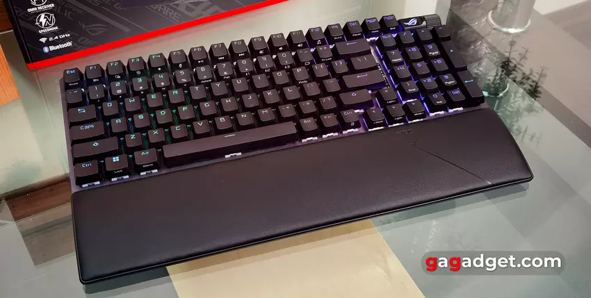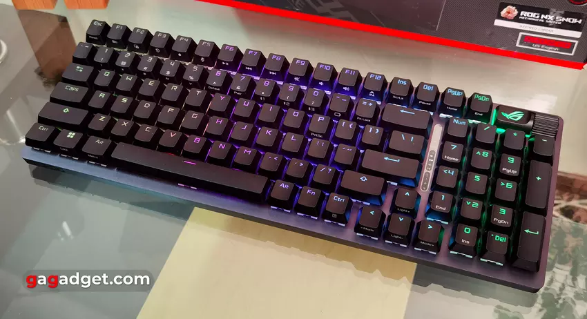 Die Tastatur verwendet neue, proprietäre mechanische ROG NX Snow-Schalter. Bei den ROG NX Snow handelt es sich um lineare Schalter, die für zusätzliche Stabilität mit einem gewandeten Schaft ausgestattet sind. Der volle Hub beträgt 3,6 mm, der Weg bis zur Betätigung 1,8 mm, die Anfangskraft 40 g, die Betätigungskraft 45 g und die maximale Kraft 53 g. Die Ressource der Schalter beträgt 70 Millionen Klicks. Sie sind ab Werk geschmiert und haben einen glatten, weichen und angenehmen Hub ohne Sand. Hot-Swapping wird unterstützt.