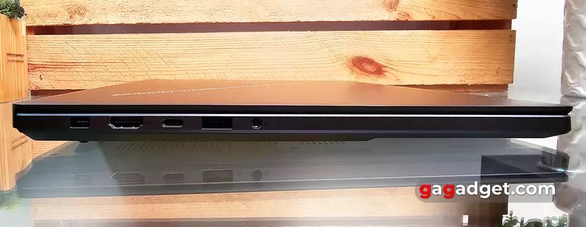 Alle Anschlüsse befinden sich an der Seite, die Rückseite ist für die Kühlung reserviert. Auf der linken Seite verfügt das Notebook über einen aktualisierten, proprietären, rechteckigen Netzteilanschluss, einen HDMI 2.1 FRL-Videoausgang, Thunderbolt 4 (mit DisplayPort-Unterstützung für integrierte Grafik und 100 W Power Delivery), USB Typ-A 3.2 Gen 2 in voller Größe sowie eine 3,5-mm-Audiobuchse.