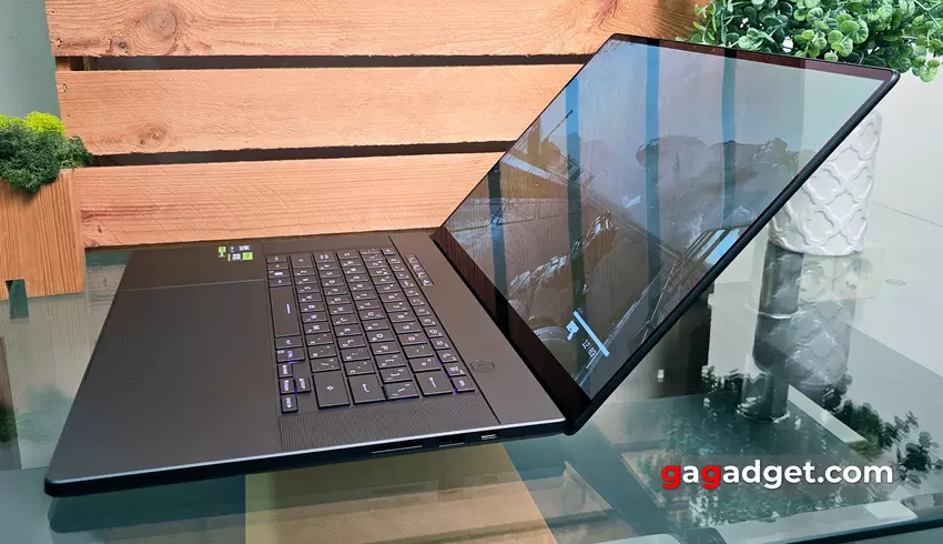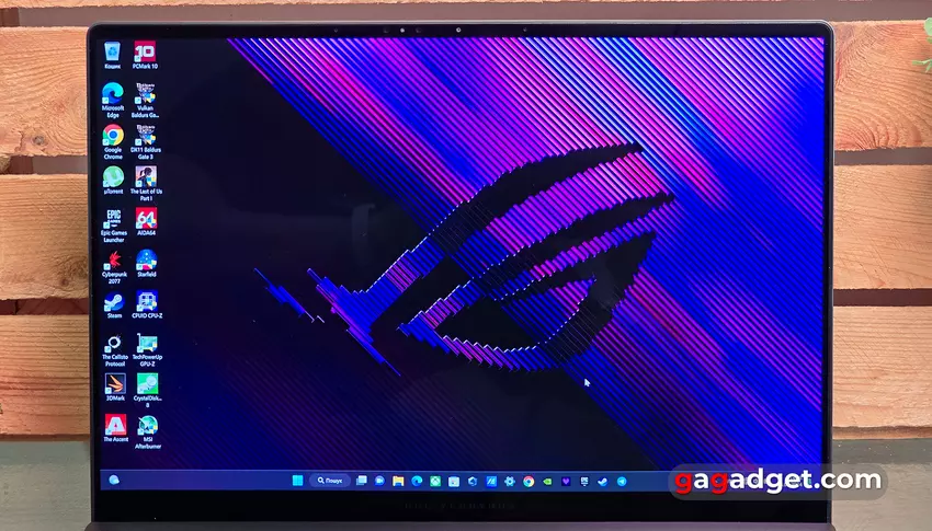 Kommen wir nun zu den Komponenten und der Leistung des ASUS ROG Zephyrus G16 (2024). Wie bereits erwähnt, zwang das dünne und leichte Gehäuse das Unternehmen dazu, einige Kompromisse einzugehen. Das gilt sowohl für den Prozessor als auch für die Grafikkarte. Normalerweise werden moderne Top-Gaming-Modelle von leistungsstarken Intel-Prozessoren der 14. Generation der HX-Serie angetrieben. In unserem Fall verwenden wir den neuen Intel Core Ultra der Meteor Lake-Familie, nämlich den Intel Core Ultra 9 185H, den wir kürzlich in unserem Test des ultraportablen ASUS Zenbook 14 OLED-Laptops (UX3405) vorgestellt haben. Zur Erinnerung: Der Prozessor verfügt über eine neue integrierte Grafik, die auf der Arc-Architektur basiert, sowie über einen separaten Neuroprozessor Intel AI Boost NPU, der für alle KI- und Machine-Learning-Operationen verwendet werden soll. Der Prozessor wird mit Intels Prozesstechnologie 4 (7 nm) gefertigt und verfügt über insgesamt 16 Kerne. 6 produktive Kerne arbeiten mit 2,3-5,1 GHz, 8 energieeffiziente mit 1,8-3,8 GHz und 2 ultra-effiziente Kerne mit 1-2,5 GHz. Es werden bis zu 22 Rechenthreads unterstützt. Der Arc-Grafikbeschleuniger hat 8 Xecoresmit einer Frequenz von bis zu 2,35 GHz. Die maximale Frequenz der Intel AI Boost NPU beträgt 1,4 GHz. Der TDP-Wert des Prozessors beträgt 28-45 W. RAM - 32 GB LPDDR5X 7467 (2x16 GB), arbeitet im Dual-Channel-Modus. Leider befindet er sich auf der Platine, so dass eine Erweiterung oder ein Austausch nicht möglich ist. Drahtlose Schnittstellen: Bluetooth 5.3 und schnelles Wi-Fi 6E (802.11ax) (Triple-Band) 2x2. Als diskreter Grafikbeschleuniger kommt das Spitzenmodell NVIDIA GeForce RTX 4090 Laptop zum Einsatz, allerdings mit einem eher bescheidenen TGP-Wert: bis zu 115W (95W + 20W Dynamic Boost). Die Frequenz liegt bei bis zu 1650 MHz und einem Boost auf 1700 MHz. Zum Vergleich: Der GeForce RTX 4090 Laptop im ASUS ROG Strix SCAR 18 (2024) hatte einen Standard TGP-Wert von bis zu 150 W und ROG Boost 175 W. Videospeicherkapazität 16 GB GDDR6. Das Notebook ist mit einem MUX-Switch-Multiplexer ausgestattet, um die Grafikkarte direkt mit dem Display zu verbinden und so die Latenz zu reduzieren und die Leistung zu erhöhen. Es unterstützt die NVIDIA Advanced Optimus-Technologie für die automatische MUX-Switch-Umschaltung.