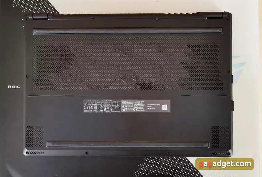 An der Unterseite des Laptops befinden sich Lautsprecher, Lüftungsöffnungen und zwei breite Gummibänder für die Stabilität. Gleichzeitig ist, traditionell für ASUS-Gaming-Modelle, die Möglichkeit einer relativ einfachen Aufrüstung gegeben. Eine der Ecklamellen der unteren Abdeckung hat ein spezielles Design. Wenn man sie abschraubt, hebt sich der Deckel, um ihn anschließend leichter öffnen zu können. Neben dem Arbeitsspeicher können Sie auch die Laufwerke aufrüsten. Es gibt zwei Steckplätze im Notebook: einer unterstützt M.2 NVMe PCIe 4.0 x4 Laufwerke, der zweite - PCIe 3.0 x4.