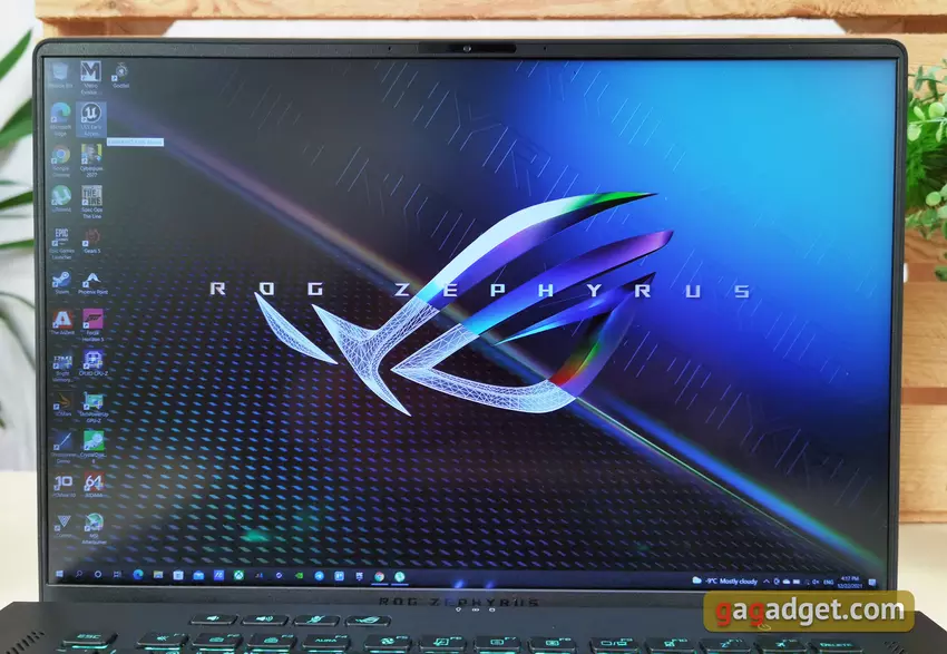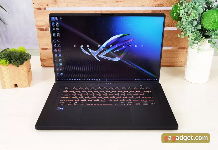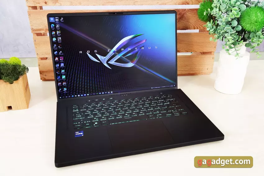 ASUS ROG Zephyrus M16 ist mit Top-End 11. Generation Intel Core i7 oder i9 Tiger Lake Prozessoren in verschiedenen Konfigurationen konfiguriert. In unserer Konfiguration war Intel Core i9-11900Heingestellt . Dies ist ein 8-Kern-Prozessor mit Unterstützung für Hyper Threading 16 Threads, die auf einem 10nm SuperFin-Prozess-Technologie hergestellt wird. Die Basistaktfrequenz beträgt 2,5 GHz, die Maximalfrequenz bis zu 4,9 GHz, der Third-Level-Cache 24 MB und der TDP 45 W. Es gibt eine integrierte UHD-Intel-Grafik mit einer Basisfrequenz von 350 MHz und einer Maximalfrequenz von 1,45 GHz, die für anspruchslose Aufgaben und im Akkubetrieb verwendet wird. Als diskrete Grafik ist die NVIDIA GeForce RTX 3070 Laptop mit einer Frequenz von bis zu 1390 MHz (ROG Boost bei 80 W) installiert, Boost bis zu 100 W wird unterstützt. Die Größe des Videospeichers beträgt 8 GB GDDR6. Der Arbeitsspeicher in unserer Konfiguration beträgt 32 GB DDR4-3200. Davon befinden sich 16 GB auf dem Motherboard und weitere 16 GB in einem Steckplatz. Der maximal unterstützte Arbeitsspeicher beträgt 48 GB. Drahtlose Schnittstellen: Wi-Fi 6 (802.11ax) und Bluetooth 5.2 (Dualband).