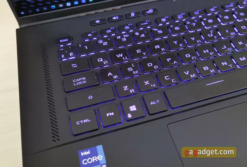 Trotz der Tatsache, dass es sich um ein 16-Zoll-Modell handelt, haben sich die Ingenieure entschieden, die Tastatur ohne einen zusätzlichen Ziffernblock zu installieren. Das ist für das Spielmodell aber nicht kritisch. Das Layout selbst ist fast Standard: die obere Reihe der Funktionstasten ist in der Höhe leicht reduziert, die beiden langen Shift-Tasten und eine einstöckige Enter-Taste. Der Pfeilblock ist leicht vom Rest der Tasten abgesetzt, hat aber eine geringere Höhe. Die Lautsprechergitter sind an den Seiten der Tastatur sichtbar. Von den zusätzlichen Tasten gibt es separate Tasten zum Einstellen der Lautstärke, zum Stummschalten des Mikrofons und zum Starten des Dienstprogramms Armory Crate. Sie befinden sich oberhalb des Hauptblocks der Tastatur. In der oberen rechten Ecke, oberhalb der Tastatur, befindet sich eine Power-Taste, die mit einem Fingerabdruckscanner kombiniert ist.