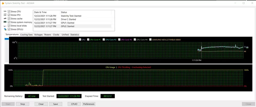 Für die Kühlung der Komponenten sind sechs Heatpipes und zwei Lüfter mit je 84 Lamellen zuständig . Und als thermische Schnittstelle kommt Flüssigmetall von Thermal Grizzly zum Einsatz. Erwähnenswert ist auch das Self-Cleaning Cooling 2.0 Staub-Selbstreinigungssystem. Das Kühlsystem kümmert sich um die Kühlung der Innenräume. Die meiste Zeit über steigt die Temperatur der Komponenten nicht über 70°, Throttling wird nicht beobachtet. Aber der Intel Core i9-11900H ist ein sehr heißer Prozessor und es ist nicht so einfach, ihn abzukühlen. CO erwies sich als ziemlich laut. Gleichzeitig wird die heiße Luft auch an das Notebook-Display abgegeben. Bei längerer Belastung wird fast die gesamte Tastatur warm, und der Bereich darüber wird heiß.