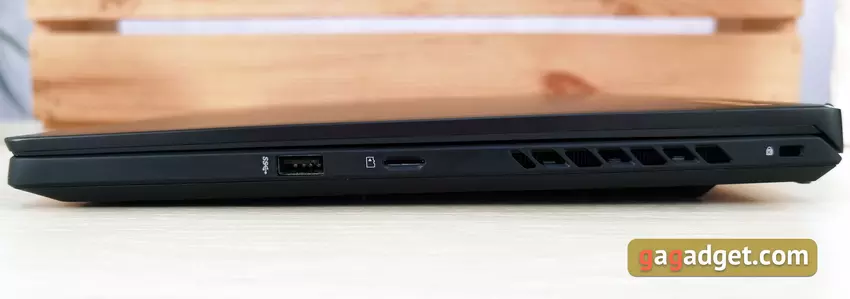 Auf der rechten Seite befinden sich ein weiterer USB 3.2 Gen 1 Typ-A-Anschluss in voller Größe, ein MicroSD 4.0-Kartenleser, ein Kensington Lock-Slot und ein weiterer Teil der Lüftungsöffnungen: