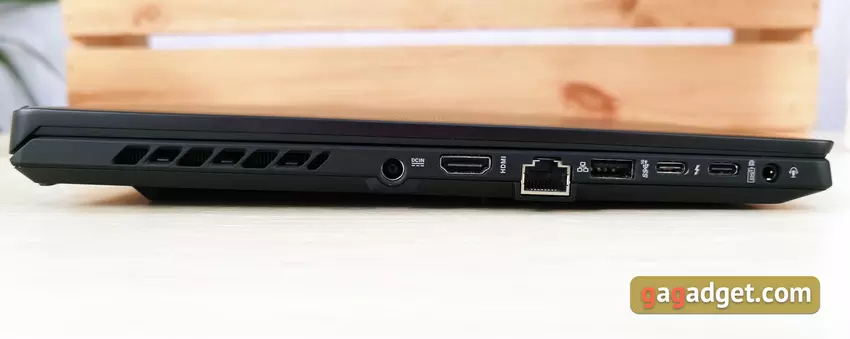 Auf der linken Seite des Laptops befinden sich Lüftungsöffnungen und eine ordentliche Anzahl von Anschlüssen. Obwohl es nicht alles gibt, was ich wollte. Auf der linken Seite befindet sich die Buchse für das Netzteil, HDMI 2.0b (idealerweise hätte ich gerne noch HDMI 2.1), Netzwerk RJ-45, USB 3.2 Gen 2 Typ-A in voller Größe, USB 3.2 Gen 2 Typ-C, Thunderbolt 4 mit Unterstützung für DisplayPort 1.4 und Power Delivery 3.0 sowie eine 3,5-mm-Kombo-Audiobuchse.