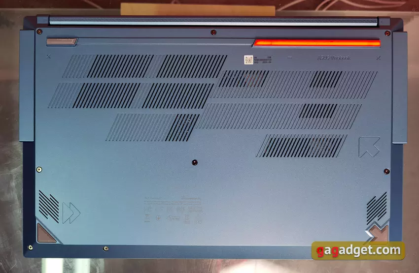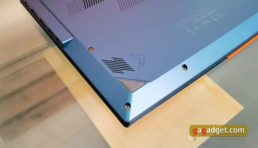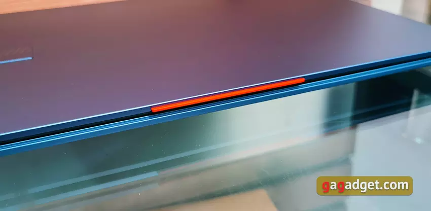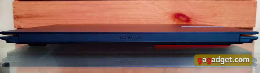 Auf der Rückseite befindet sich ein massives Scharnier, das fast die gesamte Breite des Gehäuses einnimmt, und eine Gravur mit dem Namen der Notebook-Serie.