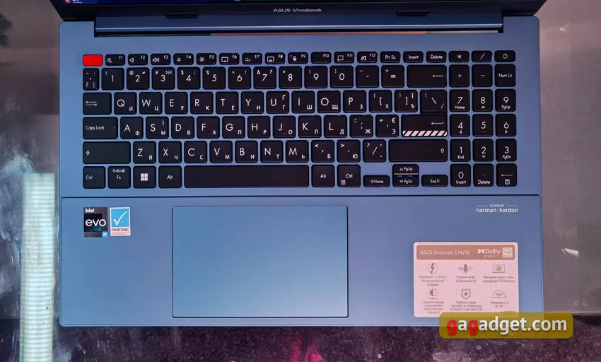 Das ASUS Vivobook S 15 OLED verwendet ein Standard-Tastaturlayout mit einem zusätzlichen Nummernblock. Das kann für diejenigen nützlich sein, die viel in Excel arbeiten oder Sonderzeichen eingeben wollen. Der Ziffernblock ist nicht vom Hauptblock getrennt. Sowohl die Umschalttaste als auch die Eingabetaste sind lang. Der Pfeilblock und die obere Reihe der Funktionstasten sind kleiner. Die Reihe endet mit der Einschalttaste, die über einen eingebauten Fingerabdruckscanner verfügt. Das Layout ist recht komfortabel, obwohl der Pfeilblock etwas größer sein könnte.