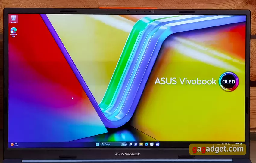 Das Notebook ist mit einem 15,6-Zoll-Display ausgestattet. Es handelt sich um ein OLED-Panel mit Full-HD-Auflösung (1920x1080), einem Standard-Seitenverhältnis von 16:9, einer Bildwiederholfrequenz von 60 Hz und einer HDR-Spitzenhelligkeit von 600 cd/m². Die Pixel-Reaktionszeit beträgt 0,2 ms und die DCI-P3-Farbskala liegt bei 100 %. Es gibt eine VESA Display HDR True Black 600 und PANTONE Validated Zertifizierung. Der Bildschirm soll bis zu 70 % des schädlichen blauen Lichts herausfiltern. Die Beschichtung ist glänzend, obwohl sie nicht so stark spiegelt wie bei Touchscreen-Modellen mit Glas. Die MyAsus-App bietet Tools, die die Lebensdauer des OLED-Panels verlängern: Bildschirmschoner, Pixelverschiebung, Ausblenden der Taskleiste, Transparenz der Taskleiste, Abdunkeln inaktiver Fenster und DC Dimming (Flimmerunterdrückung). Es gibt Splendid-Farbanzeigemodi und Farbtemperatureinstellungen.