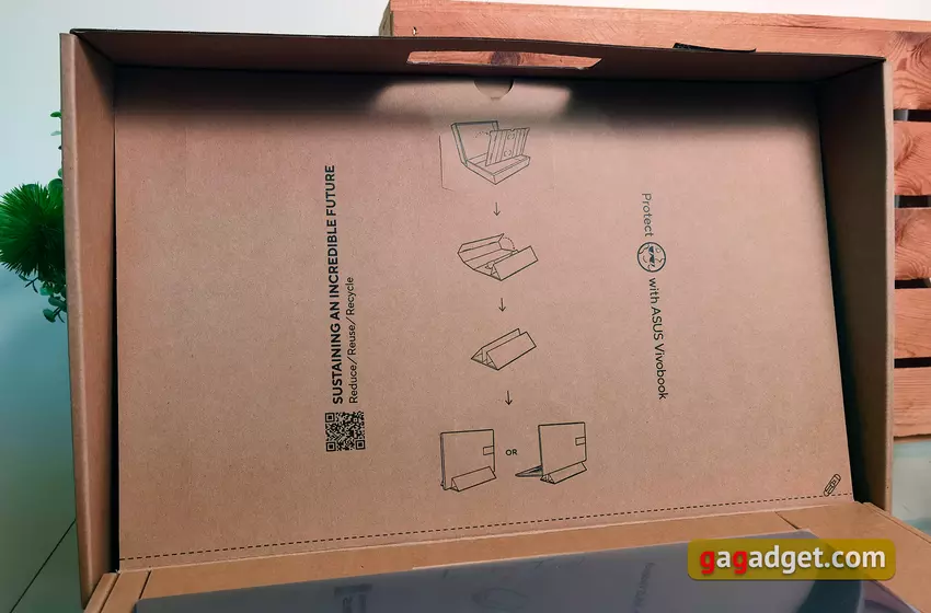 Das ASUS Vivobook S 15 OLED ist in einem schlichten senffarbenen Karton verpackt, auf dem der Modellname und die grundlegenden Informationen stehen. Darin befinden sich das Notebook, ein 90W-Netzteil, ein Netzkabel, die Dokumentation und ein Satz Aufkleber. ASUS bietet oft an, einen Teil der Verpackung als Ständer zu verwenden. Das ist auch hier der Fall: Die Innenseite der Verpackung ist zu diesem Zweck perforiert. Man kann sie abschneiden und zu einem Ständer falten, der sowohl für die Benutzung als auch für die Aufbewahrung des Laptops in einer aufrechten Position nützlich sein wird: