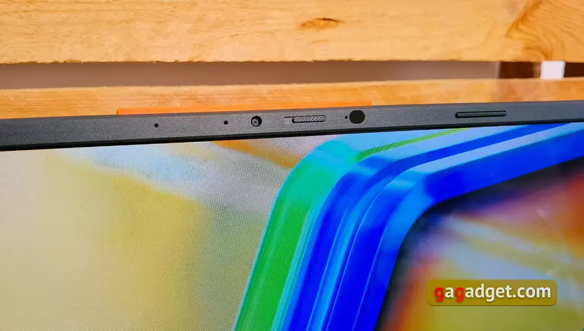 Rund um das Display befinden sich Gummieinsätze. Oberhalb des Bildschirms befindet sich eine FullHD-Webcam mit einem mechanischen Verschluss. Sie unterstützt die ASUS 3D Noise Reduction (3DNR) Technologie zur dreidimensionalen Rauschunterdrückung in Echtzeit, Hintergrundunschärfe und Helligkeitskorrektur. Darüber hinaus gibt es zwei Mikrofone, eine Kameraanzeige und einen Lichtsensor für die automatische Helligkeitsanpassung.