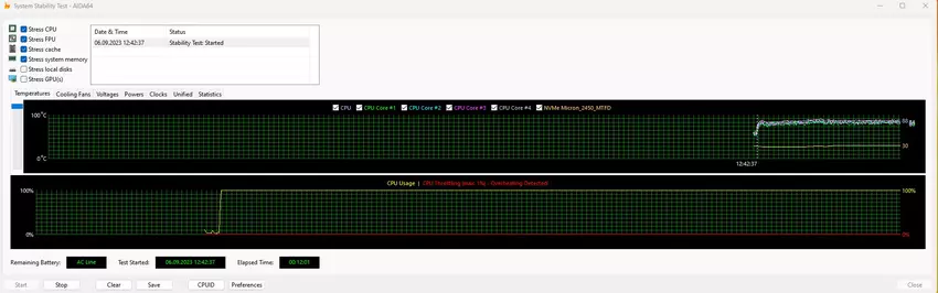 Das ASUS IceCool-Kühlsystem umfasst zwei Heatpipes mit einem Durchmesser von 8 mm und 6 mm sowie nur einen IceBlade-Lüfter mit 87 Flügeln. Normalerweise verwenden Laptops mit solch leistungsstarken Komponenten zwei Lüfter. Doch wie sich herausstellte, meistert der ASUS Vivobook S 15 OLED-Kühler seine Aufgabe. Der AIDA64-Stresstest hat gezeigt, dass die Temperatur der Komponenten auch bei längerem Gebrauch bei etwa 88° bleibt. Gleichzeitig arbeitet das System stabil, der Prozessor wird nicht gedrosselt. Der obere Teil der Arbeitsfläche erwärmt sich, was aber keinen Einfluss auf die Nutzung hat: Die Tastatur bleibt kalt. Allerdings ist der Geräuschpegel unter dieser Belastung recht hoch.