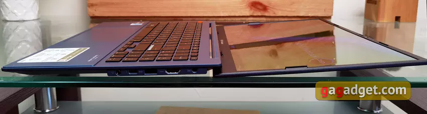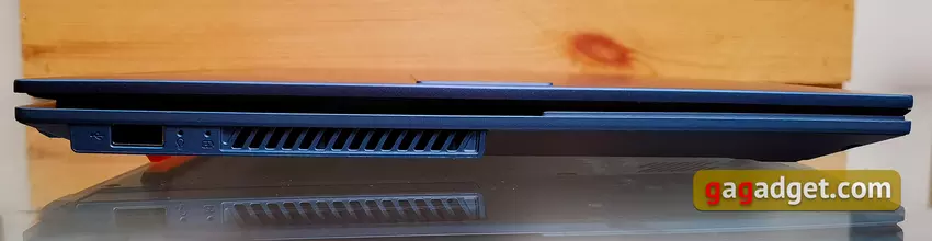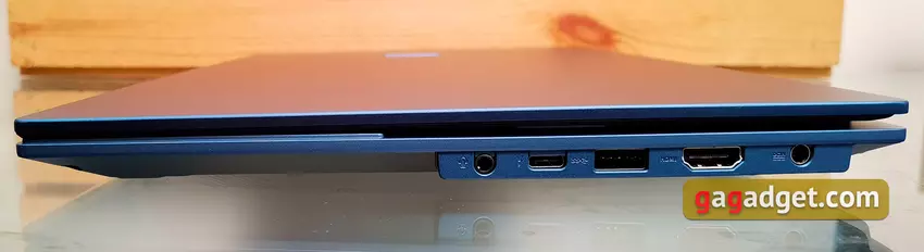 Auf der rechten Seite befinden sich eine kombinierte 3,5-mm-Audiobuchse, HDMI 1.4, USB 3.2 Gen 1 Typ-A, eine Stromversorgungsbuchse und USB Typ-C (Thunderbolt 4, 40 Gbps mit Display Port und Power Delivery). Das Notebook kann auch mit 100-W-Type-C-Geräten betrieben werden. In Anbetracht der Abmessungen ist die Anzahl der Anschlüsse nicht beeindruckend. Ein Kartenleser wäre sehr nützlich gewesen. Und die HDMI 1.4- und USB 2.0-Anschlüsse sehen ein wenig seltsam aus.