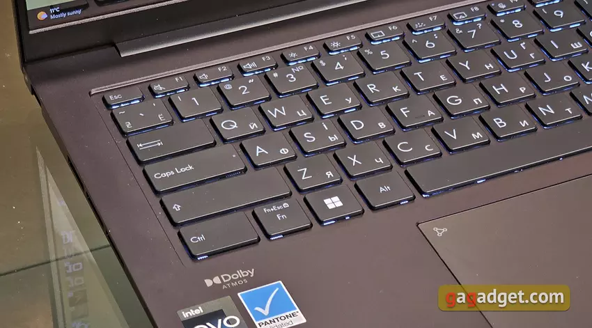 Das ASUS Zenbook 14X OLED (UX3404) verwendet eine ErgoSense-Tastatur: Der Tastenabstand beträgt 19,05 mm, die Oberfläche ist um 0,2 mm konkav und der volle Hub beträgt 1,4 mm. Dabei ragt die gedrückte Taste 0,1 mm über die Arbeitsfläche hinaus. Die Betätigungskraft liegt bei 25-34 g, die maximale Druckkraft bei 62 g. Die Tastatur ist sehr komfortabel: Der Tastenanschlag ist recht weich, aber informativ. Es gibt eine weiße Hintergrundbeleuchtung mit drei Helligkeitsstufen.