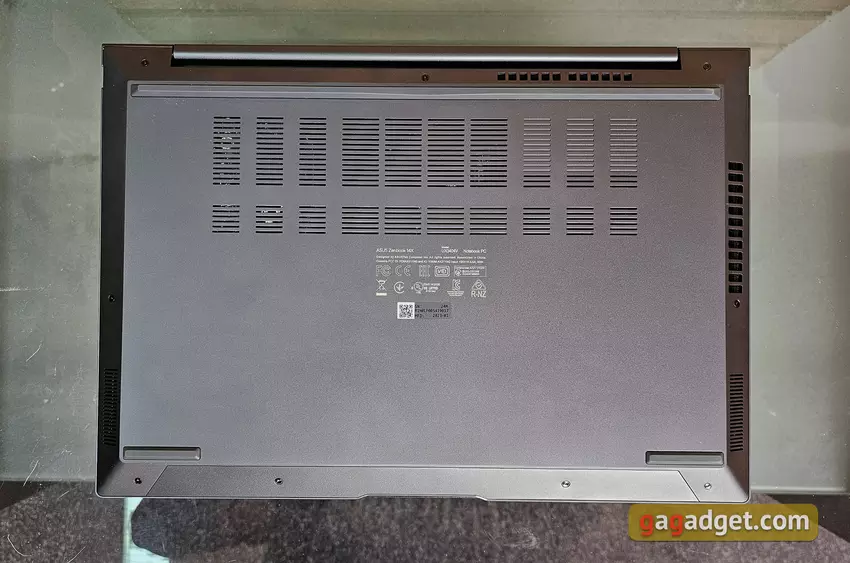 Die Unterseite verfügt über zahlreiche Lüftungslöcher und Gummifüße. An den abgeschrägten Seitenkanten befinden sich Stereolautsprecher. Die untere Abdeckung kann durch Lösen von 9 Schrauben abgenommen werden. Dies kann notwendig sein, um das Kühlsystem zu reinigen oder die SSD auszutauschen. Der Arbeitsspeicher ist auf der Platine verlötet, so dass Sie seine Kapazität nicht erhöhen können.