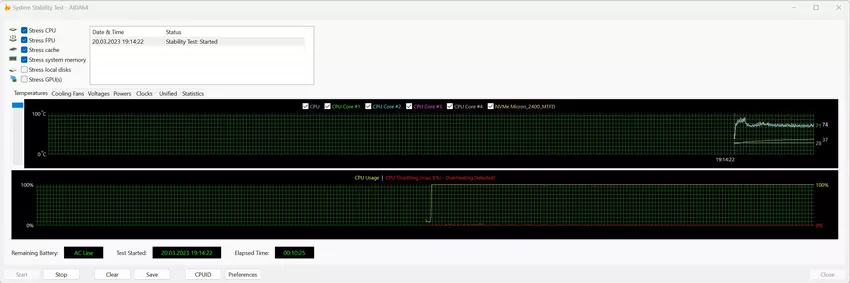 Das ASUS IceCool Kühlsystem umfasst zwei Heatpipes und einen Lüfter. Bei minimaler Belastung schaltet es in den passiven Modus und das Notebook arbeitet völlig geräuschlos. Bei maximaler Belastung ist der Lüfter hörbar, arbeitet aber leise. Das Gehäuse erwärmt sich kaum, lediglich der Bereich oberhalb der Tastatur wird warm. Zu Beginn des AIDA64-Tests erwärmt sich das System auf etwa 85° und kann die Leistung um 5 % reduzieren. Nachdem sich das Kühlsystem an die Belastung angepasst hat, bleibt die Temperatur der Komponenten bei 70-75 °C, und das Notebook arbeitet stabil.