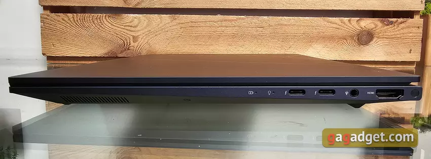Es gibt nicht allzu viele Anschlüsse, aber für ein kompaktes ultraportables Modell ist das völlig ausreichend. Auf der rechten Seite befinden sich zwei Thunderbolt 4 mit DisplayPort und Power Delivery, ein 3,5 mm Audioanschluss und HDMI 2.0b. Auf der linken Seite befinden sich zwei LED-Betriebsanzeigen.