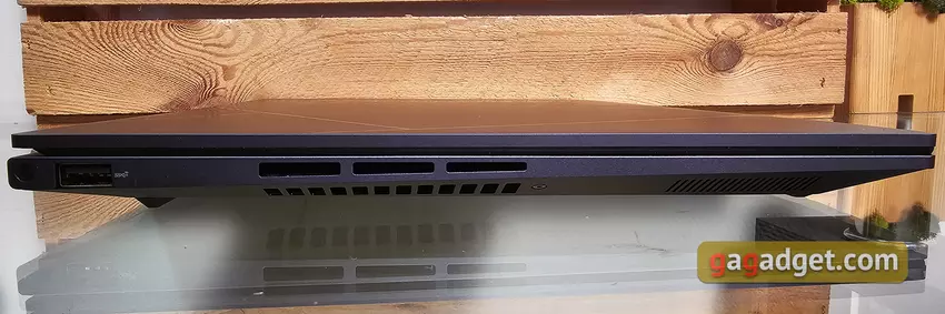 Auf der linken Seite befinden sich ein einzelner USB Typ-A 3.2 Gen 2 in voller Größe und Lüftungsöffnungen: