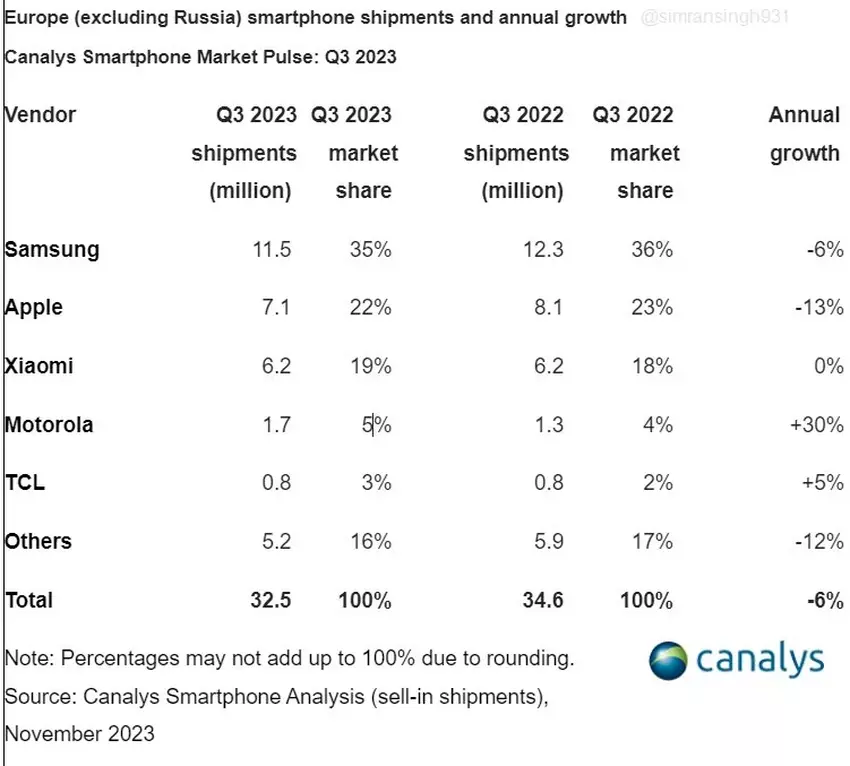 Die Top 5 werden von Motorola und TCL abgerundet, die 1,7 Millionen bzw. 0,8 Millionen Smartphones absetzen konnten. Alle anderen Hersteller verkauften zusammen 5,2 Millionen Geräte. Insgesamt wurden im Berichtszeitraum 32,5 Millionen Smartphones ausgeliefert, 6 Prozent weniger als im dritten Quartal 2022.