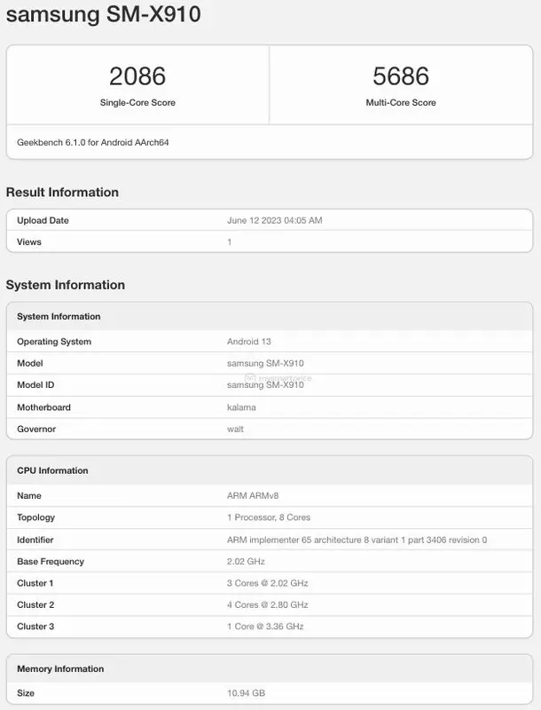 Die Neuheit kommt mit der Modellnummer SM-X910. Der Leak bestätigt frühere Gerüchte. Das Gerät wird mit dem Snapdragon 8 Gen 2 for Galaxy Chip ausgestattet sein. Der gleiche SoC findet sich auch in den Galaxy S23-Smartphones. Er unterscheidet sich von der regulären Snapdragon 8 Gen 2-Version durch eine auf 3,36 GHz übertaktete Prime-Kernfrequenz. Das Tablet wird außerdem mit 12 GB RAM ausgestattet sein. Die Neuheit wird ab Werk mit dem Betriebssystem Android 13 und One UI 5.1 oder One UI 5.1.1 laufen.