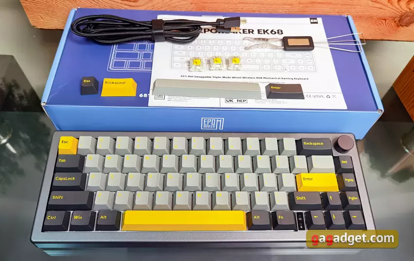 Die Epomaker EK68 wird in einer blauen Pappschachtel mit einer schematischen Abbildung und grundlegenden technischen Informationen geliefert. Die Verpackung ist recht interessant. Neben der Tastatur selbst enthält der Karton ein Type-C-Kabel zum Aufladen und für die kabelgebundene Verbindung, einen Miniatur-USB-Sender, zusätzliche Esc-, Space-, Enter- und Backspace-Tastenkappen, ein Werkzeug zum Entfernen von Tastenkappen und Schaltern, drei Ersatzschalter und ein englisches Handbuch. Sie sollten es nicht vernachlässigen: Die meisten Tastatureinstellungen werden über Tastenkombinationen vorgenommen.