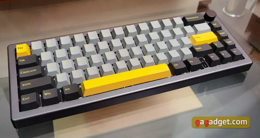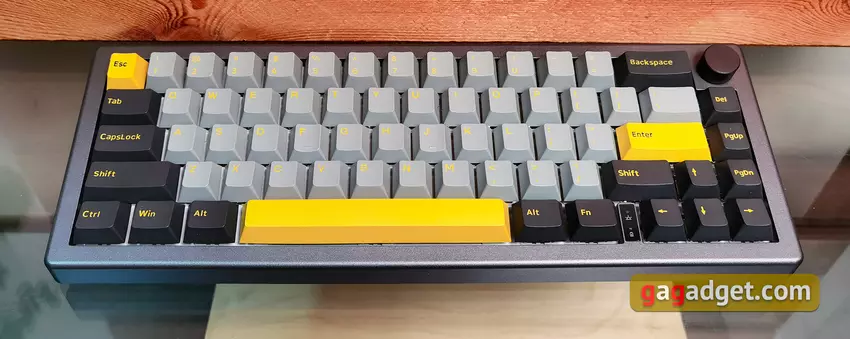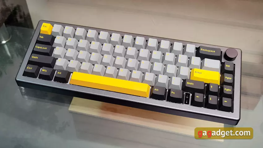 Die Epomaker EK68 ist eine 65%-Tastatur mit 66 Tasten und einem Drehknopf in der oberen rechten Ecke, der für die Lautstärkeregelung beim Scrollen und die Stummschaltung beim Drücken zuständig ist. Sie hat einen klaren und angenehmen Bildlaufschnitt. Neben dem Fehlen eines zusätzlichen Nummernblocks weist die Tastatur einige weitere wichtige Merkmale auf. Sie verfügt nicht über die F-Reihe sowie die Tasten PrtScr, Scroll Lock, Pause, Home, End, ~, Insert. Alle diese Tasten sind durch Kombinationen mit Fn verfügbar. Zum Beispiel die Tasten F - Fn + Reihe von 1 bis +. Der Navigationsblock ist nicht von den anderen Tasten getrennt, weshalb die rechte Umschalttaste etwas kürzer ist. Und die Tasten Del, PgUp und PgDn befinden sich senkrecht über dem rechten Pfeil. Und zwischen dem linken Pfeil und Fn befinden sich zwei LEDs. Es gibt keine separate CapsLock-Anzeige, aber die Anzeige wird durch die Hintergrundbeleuchtung der Taste realisiert: Sie ändert ihre Farbe. Es dauert also eine Weile, bis man sich an dieses Layout gewöhnt hat. Aber Kenner solch kompakter Modelle wissen in der Regel, worauf sie sich einlassen. Bei Spielen sollte es keine Probleme geben: alle notwendigen Tasten sind vorhanden.