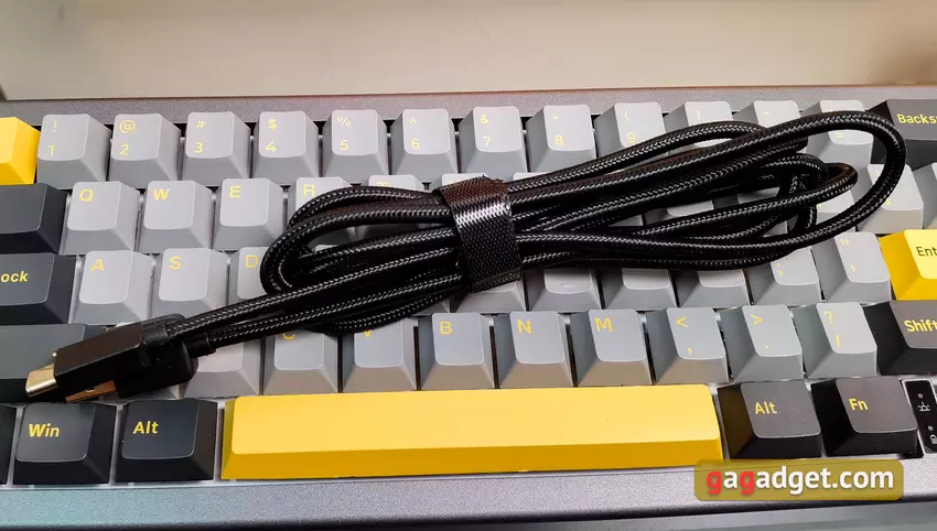 Die Epomaker EK68 hat ein klassisches Design mit einer gemeinsamen Abdeckung, so dass die mechanischen Schalter nicht sichtbar sind. Die Tastatur ist sehr kompakt und nimmt nicht viel Platz in Anspruch, aber das Layout ist sehr ungewöhnlich, so dass es etwas gewöhnungsbedürftig ist. Das Modell ist in mehreren Farbvarianten erhältlich: in ruhigem Schwarz und Grau, in Schwarz und Lila sowie in Schwarz und Grau mit Gelb, wie wir es im Test haben. Es sieht ziemlich originell und ungewöhnlich aus. Ob es Ihnen gefällt oder nicht, ist eine individuelle Angelegenheit. Alle Designelemente sind matt, so dass sich auf der Tastatur keine Fingerabdrücke festsetzen können.