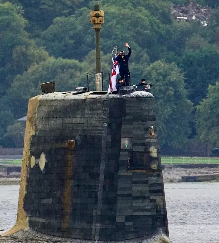 Die Bilder wurden bei der Rückkehr des Atom-U-Boots zum Marinestützpunkt Clyde in Schottland aufgenommen. Die britische Royal Navy verfügt über insgesamt vier U-Boote der Vanguard-Klasse, die mit ballistischen Interkontinentalraketen vom Typ Trident II (D5) ausgestattet sind, die nukleare Sprengköpfe tragen können.