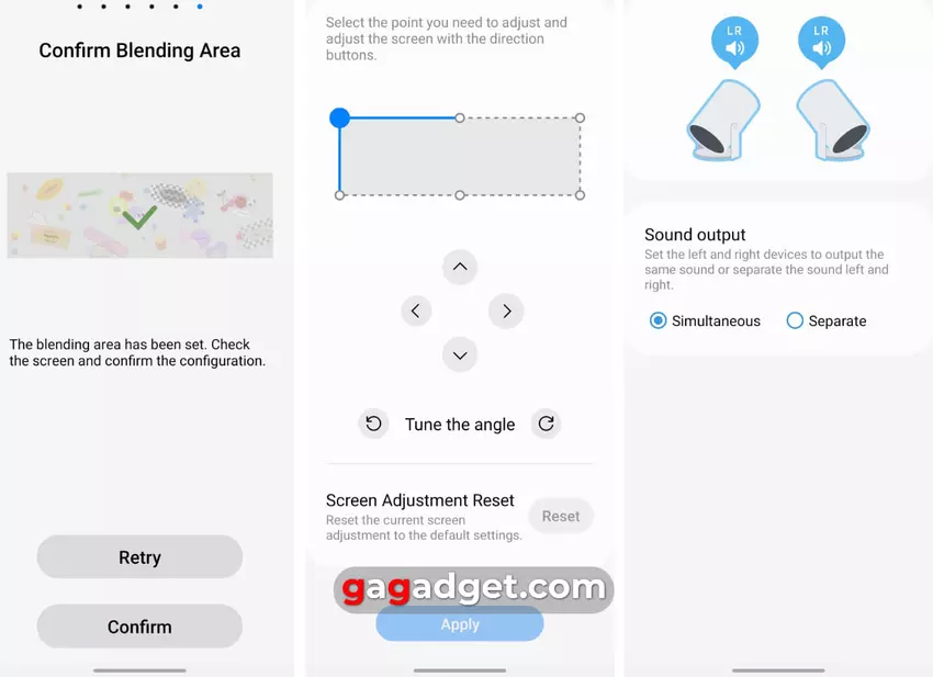 Wenn der Algorithmus mit Ihrem Bild zufrieden ist, sehen Sie einen Bestätigungsbildschirm. Als Nächstes können Sie optional das gemeinsame Bild ein wenig korrigieren (bei mir war das nicht nötig) und wählen, wie der Ton an die Projektoren geleitet werden soll - für jeden Projektor einzeln oder als Stereopaar über die Lautsprecher. Wie Sie sehen können, war alles ganz einfach und funktionierte auf Anhieb (ich wünschte, das wäre bei neuen Technologien und Funktionen immer so).