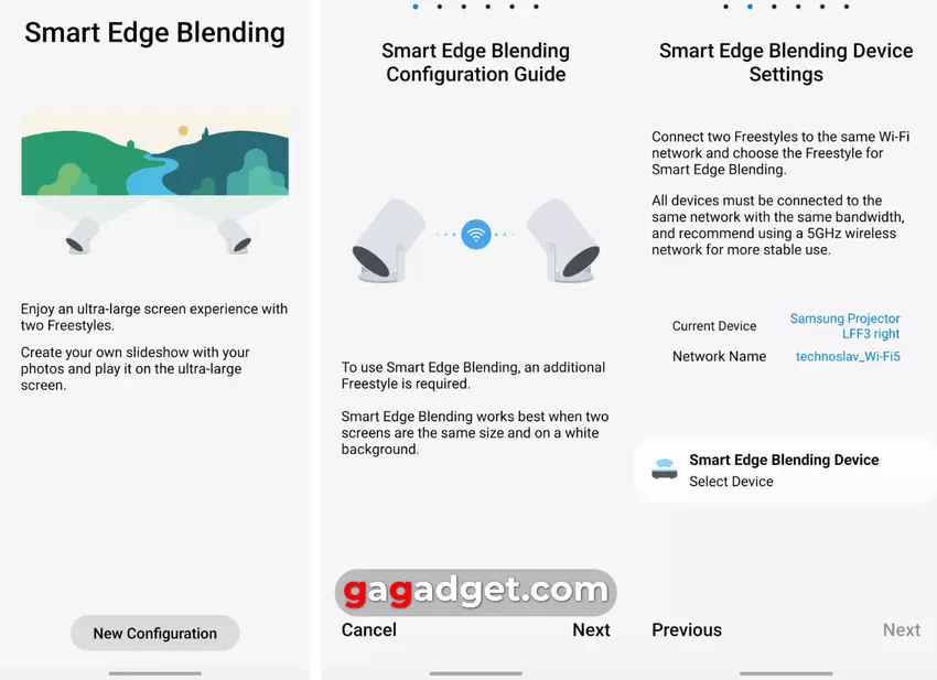 Nach dem Anschluss des Projektors erscheint in der SmartThings-App ein neuer Punkt " Smart Edge Blending ", der für die Zwei-Geräte-Konfiguration zuständig ist.