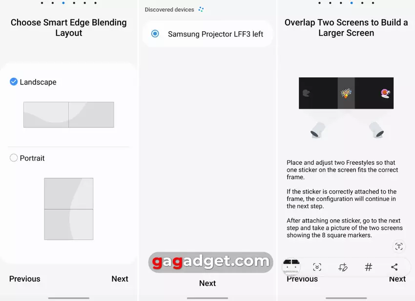 Der einzige Nachteil der Panoramafunktion ist, dass die Bildquelle auf Ihr Smartphone beschränkt ist. Das heißt, alles, was auf dieses große Bild von zwei Projektoren gerichtet werden kann, ist entweder ein Foto aus der Smartphone-Galerie. Sie können aber auch in den Bildschirmspiegelungsmodus wechseln und einige Aktionen (oder Inhalte) vom Smartphone selbst zeigen. Auf diese Weise können Sie Netflix darauf laufen lassen und einen Film auf einem Bildschirm mit einer außergewöhnlichen Diagonale von bis zu 160 Zoll ansehen. Allerdings muss das Smartphone die Bildschirmspiegelung unterstützen, was nicht alle Modelle zu können scheinen.