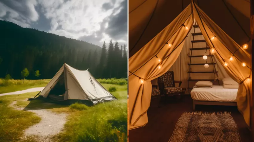 Der Unterschied zwischen Camping und Glamping (Bild generiert von Midjourney)