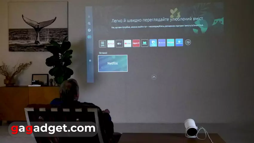 Das Projektormenü wird allen Nutzern von Samsung-Fernsehern vertraut sein. Es handelt sich um eine Tizen-basierte Smart TV-Oberfläche mit allen Vorteilen eines App-Stores ( Netflix, Amazon Prime, Apple TV und lokale SweetTV- oder Megogo-Videodienste sind vorinstalliert) und Integrationsmöglichkeiten sowie dem proprietären SmartThings Smart Home Control System. Kennen Sie generell viele tragbare Projektoren mit Smart TV-Unterstützung? Moderne Schnittstellen versuchen, die Dinge einfach zu halten und Einstellungen zu verstecken, die einmal im Monat verwendet werden, und alles, was täglich verwendet werden muss, im Blickfeld zu lassen. Genau das ist die Oberfläche dieses Projektors - alles ist klar und übersichtlich. Selbst wenn Sie noch nie einen Tizen-Fernseher benutzt haben, müssen Sie sich nicht erst an die Bedienelemente gewöhnen. Wenn doch, können Sie SmartThings-Szenarien oder eine manuelle Bildkorrektur einrichten oder mit verschiedenen Bildmodi herumspielen (die übrigens nicht tief im Menüdschungel versteckt sind).