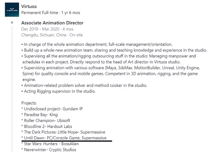 Aufmerksame Reddit-Nutzer fanden heraus, dass das LinkedIn-Profil des Animators Naceri Lu darauf hinweist, dass er zwischen Dezember 2019 und März 2020 bei Virtuos Studios arbeitete und eines der Projekte Until Dawn anzeigte, und zwar in Versionen für PC und Konsolen, was besonders interessant ist, da das Spiel zuvor nur auf PS4 veröffentlicht wurde. Dies korreliert vollständig mit den Worten von billbil-kun, der sagt, dass die verbesserte Version von Until Dawn nicht nur auf PS5, sondern auch auf PC erscheinen wird.