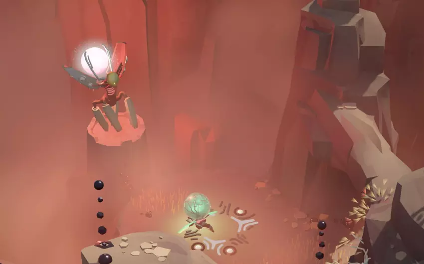 Der Spielablauf basiert auf den Kugeln, die der Käfer auf seinem Rücken trägt. Es gibt 4 Kugeln im Spiel, aber um nicht alle Überraschungen zu verraten, werde ich dir nur von den ersten beiden erzählen. Die orangefarbene Kugel ist die erste, die gefunden werden muss. Sie öffnet den Zugang zur sandigen Welt, und wenn wir sie auf dem Rücken tragen, schafft sie eine Verbindung zwischen speziellen Brücken, um zu einem anderen Teil des Ortes zu gelangen. Mit der grünen Kugel kann man eine Welt voller Seen und Bäume betreten. Wenn du mit einer grünen Kugel auf dem Rücken gehst, kannst du mit ihr spezielle Stangen hoch- oder runterfahren, was dir ebenfalls hilft, dich durch den Ort zu bewegen.