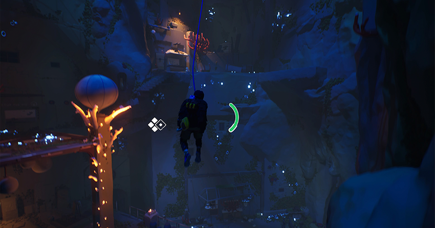 Es kann auch vorkommen, dass es bis zum nächsten Felsvorsprung zu weit ist und man einen Gegenstand braucht, an dem man das Seil als Bungee-Seil einhaken und zum nächsten Aufstiegsort fliegen kann.