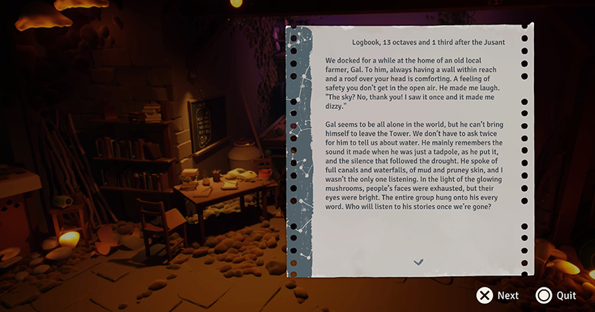 Ein Spiel zu entwickeln, in dem alles ausschließlich durch die Spielwelt erzählt wird, ist keine leichte Aufgabe, denn man muss diese Welt so gestalten, dass der Spieler immer wieder Lust bekommt, sie zu erkunden. Und diese Lust verließ mich nicht, bis der Abspann rollte. Schon am ersten Ort begann ich, in allen Ecken nach einer Antwort zu suchen, und hörte bis zum Finale nicht mehr auf. Ich frage mich, wie zum Beispiel die Menschen, die am Fuße des Berges und in den Höhlen lebten, kommuniziert haben. Das Spiel zeigt einem etwas Neues und man hat sofort Fragen im Kopf: "Wie war das organisiert?" Und schon suchen wir nach Antworten. Aber da die meisten Orte klein sind, findet man schnell die meisten Antworten. Ich würde nur die Anzahl der Notizen reduzieren, aber dazu später mehr.