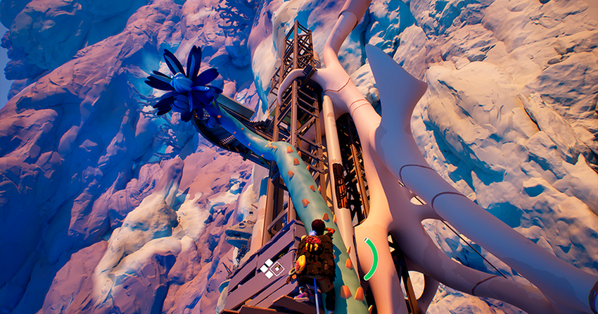 Und der Turm verändert sich ständig. Wir beginnen am Fuße des Turms, wo es hauptsächlich Steine gibt. Später finden wir uns an einem Ort wieder, der einer Wüste ähnelt. Plötzlich werden wir in malerische Höhlen geführt, die von Biolumineszenz beleuchtet werden. Danach werden wir von der Spitze eines mit Gras bewachsenen Turms begrüßt. Und das ist noch nicht alles an Biomen, Flora und Fauna, was die Spieler in Jusant erwartet.