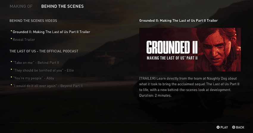 Sie können sich den Trailer (außer auf dem Naughty Dog YouTube-Kanal) unter dem Reiter "Making of" ansehen, indem Sie "Hinter den Kulissen" auswählen. Dort können Sie sich auch eine Reihe von Podcasts anhören, in denen Entwickler und Schauspieler über wichtige Aspekte des Spiels sprechen.