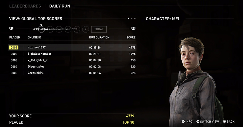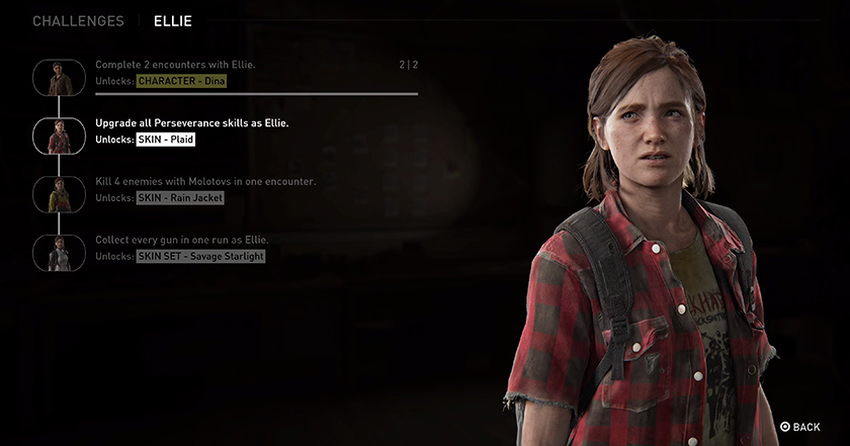 Für Ellie gibt es zum Beispiel 4 Herausforderungen: zwei Levels gewinnen (wodurch Dina freigeschaltet wird), einen Fertigkeitszweig vollständig aufwerten, 4 Gegner mit einem Molotow-Cocktail töten und alle möglichen Waffen in einem Durchgang sammeln. Die letzten drei Herausforderungen schalten verschiedene Kostüme für die Heldin frei.