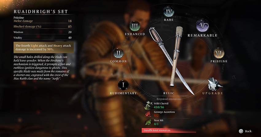 Es gibt zwei Arten von Gegenständen: für Rot und Anthea. Ersterer hat eine Rüstung, ein Schwert, eine Waffe und ein Fläschchen, das die Gesundheit wiederherstellt. Anthea hat verschiedene Accessoires wie Ringe oder Halsketten, die ihre magischen Fähigkeiten verbessern. All diese Dinge werden mit Hilfe von Ressourcen verbessert, die überall in der Welt verstreut sind, die man für die Erfüllung von Aufgaben erhält oder die man bei Händlern kaufen kann. Manchmal findet man jedoch zusätzlich zu den Ressourcen auch neue Gegenstände oder eine Währung, für die man dieselben Ressourcen oder Gegenstände kaufen kann.