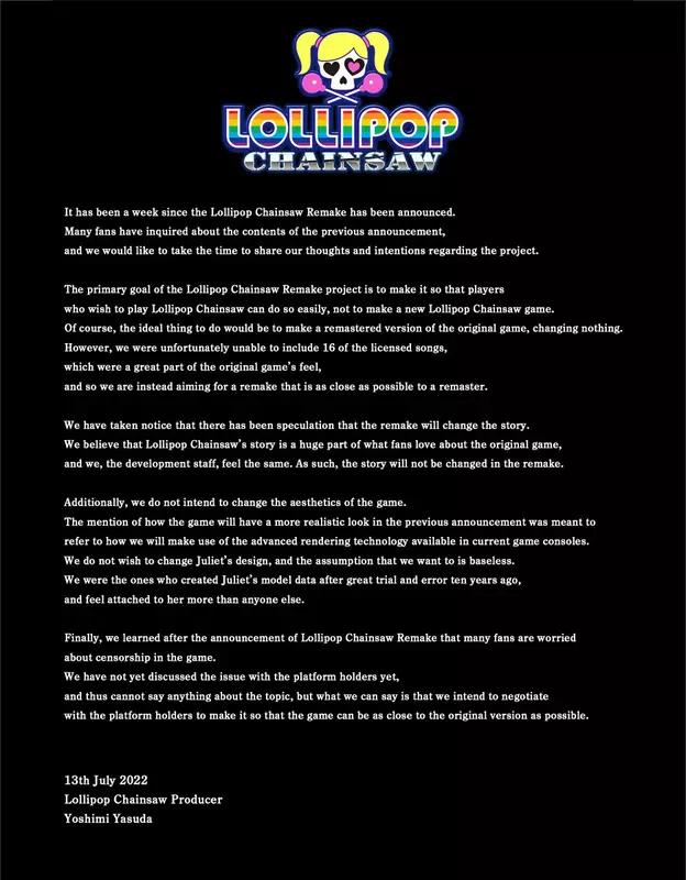 Anfang dieses Monats kam die Nachricht, dass ein Remake von Lollipop Chainsaw - einem verrückten japanischen Slasher über eine Cheerleaderin mit einer Kettensäge - in Arbeit ist. Die Ankündigung des Remakes säte sofort Angst in den Herzen der Fans des Originals - ihnen gefielen einige Details der kommenden Version nicht. Der Produzent des Projekts, Yoshimi Yasuda, versuchte, die Hauptgefühle zu zerstreuen.