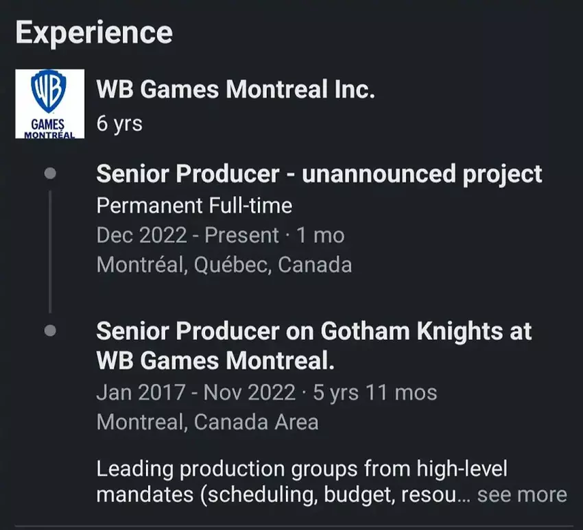 Das geht zumindest aus dem Profil von Gotham Knights Senior Producer Bryan Theberge hervor, der diesen Monat zum Entwicklerteam gestoßen ist.