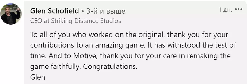 Gamer und Kritiker waren äußerst zufrieden mit dem Remake von EA Motive, aber alle waren neugierig auf die Reaktion des "Vaters" des Horrorspiels. Und so meldete sich Glen Schofield zu Wort: Er bedankte sich bei allen, die am Originalspiel und am Remake mitgearbeitet haben, und fügte hinzu, dass die neuen Entwickler die von ihm geschaffene Atmosphäre von Dead Space perfekt wiedergegeben haben. Er lobte die sorgfältige Herangehensweise an die Nachbildung seines Spiels und die Genauigkeit, mit der alle Nuancen des Horrors vermittelt wurden.