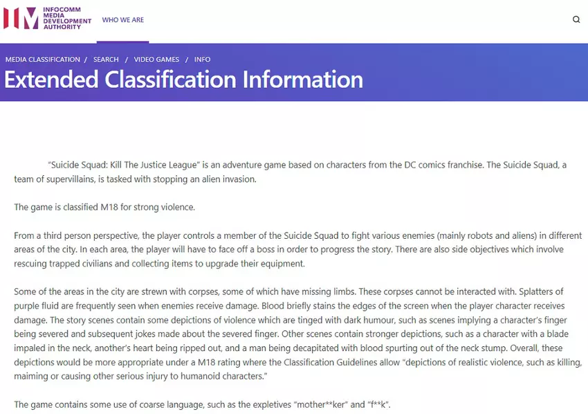 Die IMDA-Experten sind zu dem Schluss gekommen, dass Suicide Squad: Kill the Justice League für Spieler ab 18 Jahren geeignet ist, was sich in der Einstufung M18 widerspiegelt.