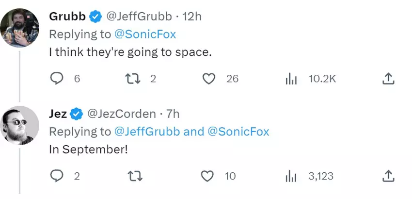 Und dann kamen die allegorischen Andeutungen von zwei angesehenen Insidern: Jeff Grubb kommentierte den Beitrag mit "They're going into space", während Jez Corden fortfuhr: "Im September".